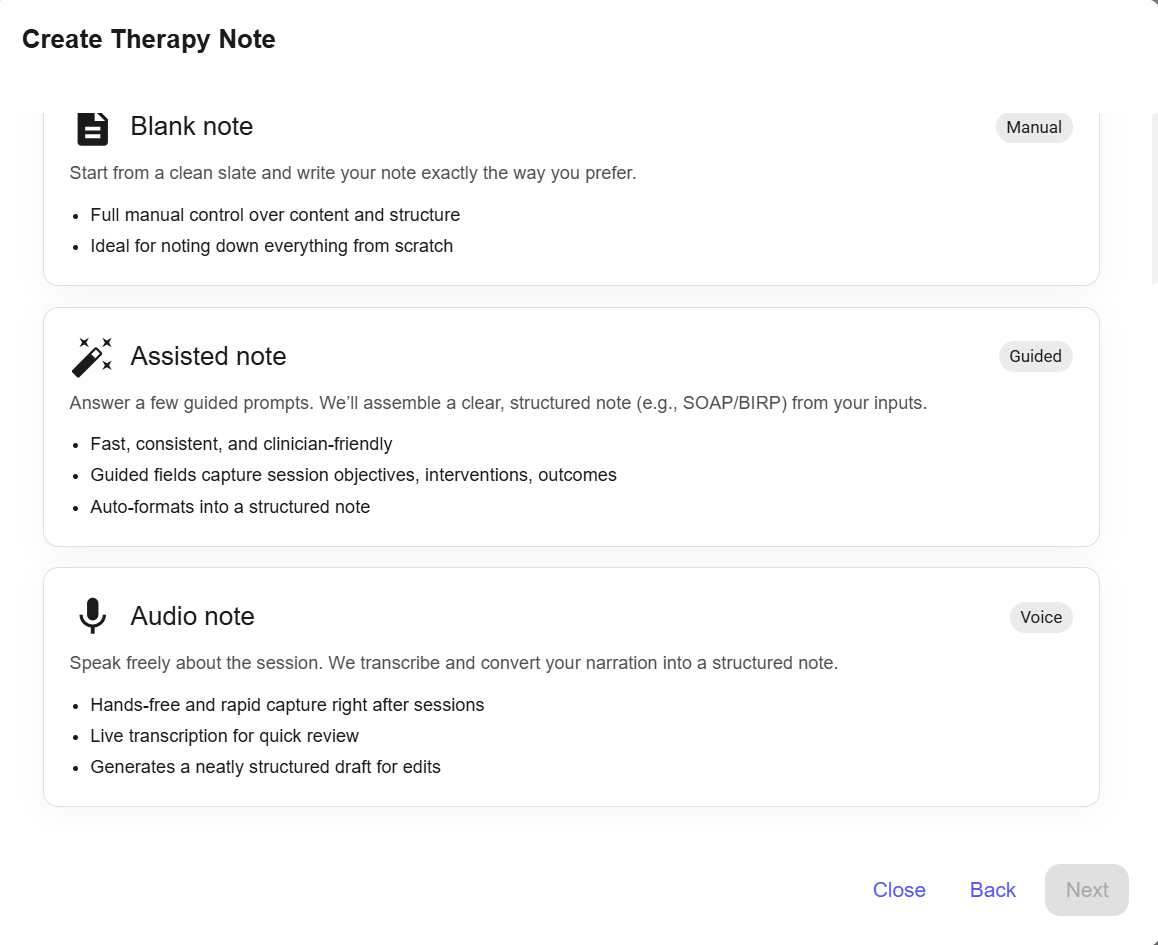 Speak Your Thoughts Aloud - Simply talk through your reflections after a session, and our audio-to-note algorithm will transcribe your voice into a well-structured session note.
