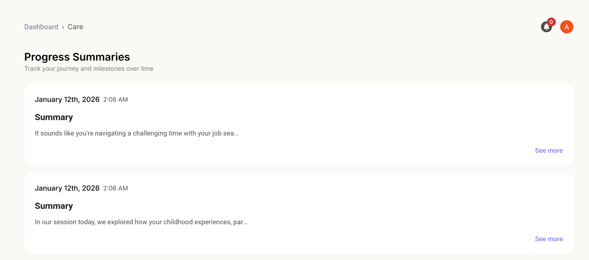 By capturing day-to-day reflections and progress in one place, the platform helps maintain continuity of care. Individuals stay more engaged with their mental wellbeing, and therapists gain timely context that can inform more meaningful, focused sessions. Together, this creates a more connected experience where support doesn’t pause when the session ends.